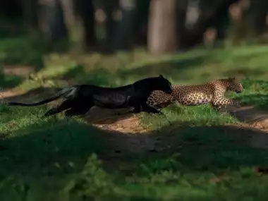 यह तस्वीर जंगल की है। तेंदुआ और ब्लैक पैंथर दौड़ रहे थे। इसी दौरान फोटोग्राफर ने दोनों को कैमरे में कैद कर लिया। यह तस्वीर देखकर पता चलता है कि फोटोग्राफर ने इस अद्भुत लम्हे के लिए कितनी मेहनत की है। उन्होंने एक फ्रेम में दोनों ही तेंदुओं को ऐसे कैद किया है कि आप उनकी खूबसूरती को आसानी से निहार सकते हैं। उनके शरीर के पैर्टन और बनावट आदि सब शानदार तरीके से कैप्चर हुआ है। बता दें, मेलानिस्टिक तेंदुआ को सामान्य भाषा में ब्लैक पैंथर (Black Panther) के रूप में जाना जाता है। इसका रंग या तो पूरी तरह से काला होता है या फिर यह गहरे रंग का होता है, जो दक्षिण भारत के घने जंगलों में पाया जाता है।