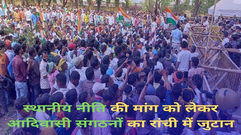झारखंड में 1932 के खतियान समेत स्थानीय नीति लागू करने की मांग को लेकर रांची में आदिवासी संगठनों का जुटान हुआ. हजारों की संख्या में रांची पहुंचे आदिवासी संगठनों के लोगों ने विधानसभा घेराव करने निकले, लेकिन इससे पहले पुलिस ने उसे रोक दिया. इस दौरान जमकर नारेबाजी हुई. आदिवासी संगठनों के विरोध प्रदर्शन के कारण रांची के नया सराय रिंग स्थित रोड जाम हो गया.