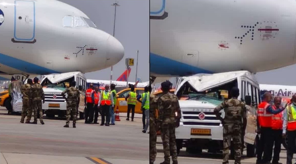 बेंगलुरु के केम्पेगौड़ा अंतरराष्ट्रीय हवाई अड्डे पर सोमवार को एक टेम्पो ट्रैवलर वाहन गलती से खड़े इंडिगो ए320 विमान से टकरा गया।